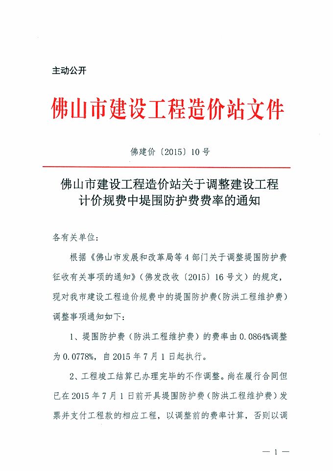 佛山市建設(shè)工程造價站關(guān)于調(diào)整建設(shè)工程計價規(guī)費中堤圍防護費費率的通知