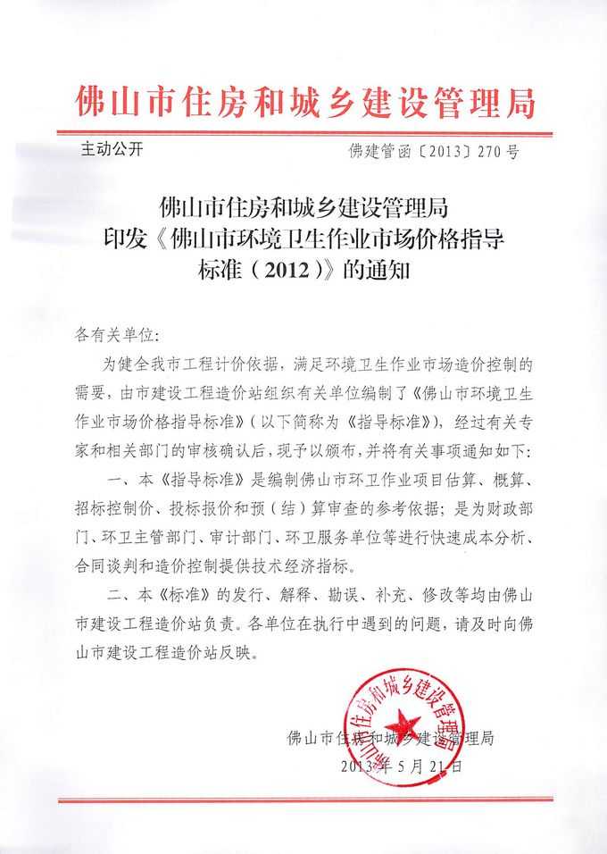 印發《佛山市環境衛生作業市場價格指導標準(2012)》的通知