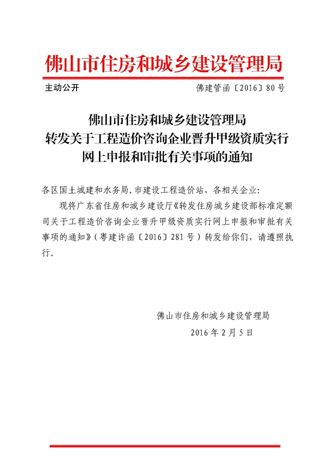 佛山市住房和城鄉建設管理局轉發關于工程造價咨詢企業晉升甲級資質實行網上申報和審批有關事項的通知