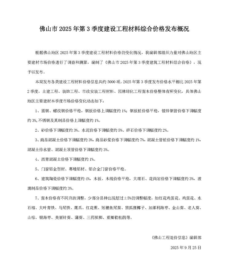 佛山市2025年第3季度建設工程材料綜合價格發布概況