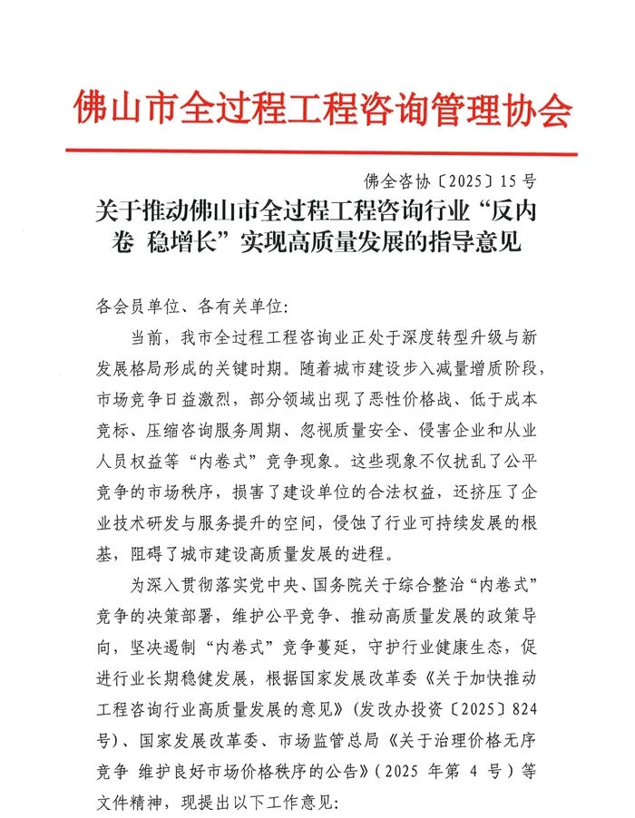 關于推動佛山市全過程工程咨詢行業“反內卷 穩增長”實現高質量發展的指導意見
