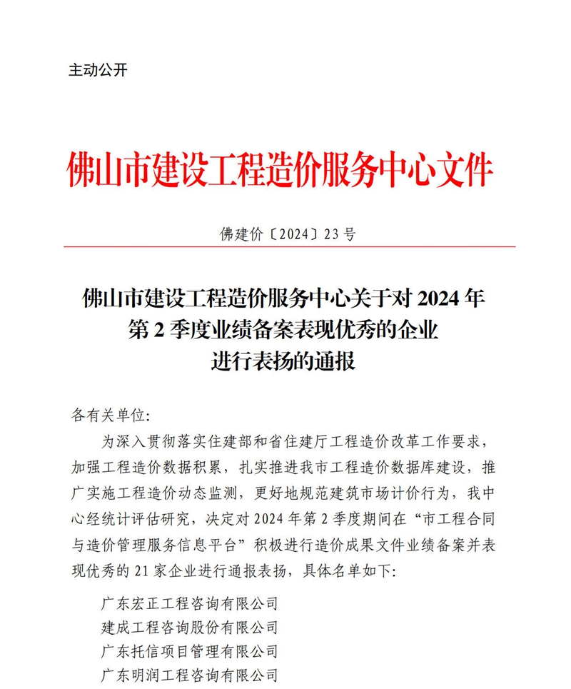 轉(zhuǎn)發(fā) | 佛山市建設(shè)工程造價(jià)服務(wù)中心關(guān)于對(duì)2024年第2季度業(yè)績(jī)備案表現(xiàn)優(yōu)秀的企業(yè)進(jìn)行表?yè)P(yáng)的通報(bào)