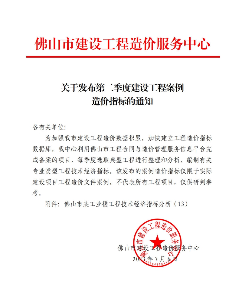 關(guān)于發(fā)布第二季度建設(shè)工程案例造價(jià)指標(biāo)的通知
